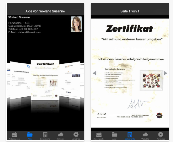 Darüber hinaus kann jeder Dokumentenprozess in der Personalabteilung angestoßen werden: Sei es das Mitarbeitergespräch oder die Mitarbeiterbeurteilung, das Bewerbermanagement, Jahresgespräche, die Einstellung, die Versetzung oder der Mutterschutz. HR-Dokumente können im Handumdrehen nun online absolut fehlerfrei erzeugt werden: Zeugnisse, Verträge sowie jegliche Korrespondenz. Und das auch auf dem iPhone und dem iPod touch!